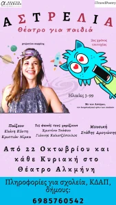 Η Αστρέλια θα μοιραστεί με τους μικρούς μας φίλους μυστικά από τον πλανήτη της, θα τους χαρίσει στιγμές γέλιου και μυστηρίου, θα τους μιλήσει για την αγάπη αλλά και μαζί τους θα ανακαλύψει την έννοια της συγχώρεσης !